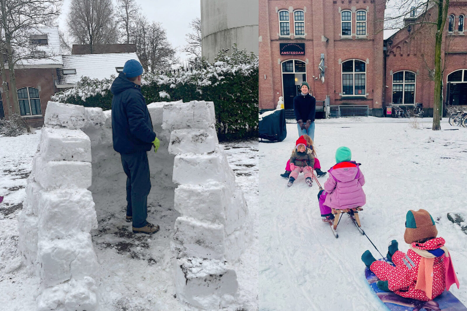 In de ochtend gooide buurman Jos vanuit z’n raam sneeuwballen naar de kleine Matéo voor wie het zijn eerste echte sneeuwervaring was. Hij vond de sneeuw heerlijk en wonderlijk. De sneeuwballen ploften links en rechts naast hem neer, zonder hem te deren. Een paar uur later was er zo royaal veel sneeuw gevallen dat er gerold en verzameld werd voor sneeuwpoppen in alle soorten en maten. Er werd zelfs een ware iglo gebouwd, dit alles afgewisseld met sleetje rijden en glijden. Terwijl de kleintjes hun interesse al verloren hadden werd er door de groten nog hard doorgewerkt aan de iglo. Toen het donker was zette Mathijs er nog een lichtje in, waardoor het er heel gezellig uitzag en veel voorbijgangers stil bleven staan bij dit sprookjesachtige beeld.
